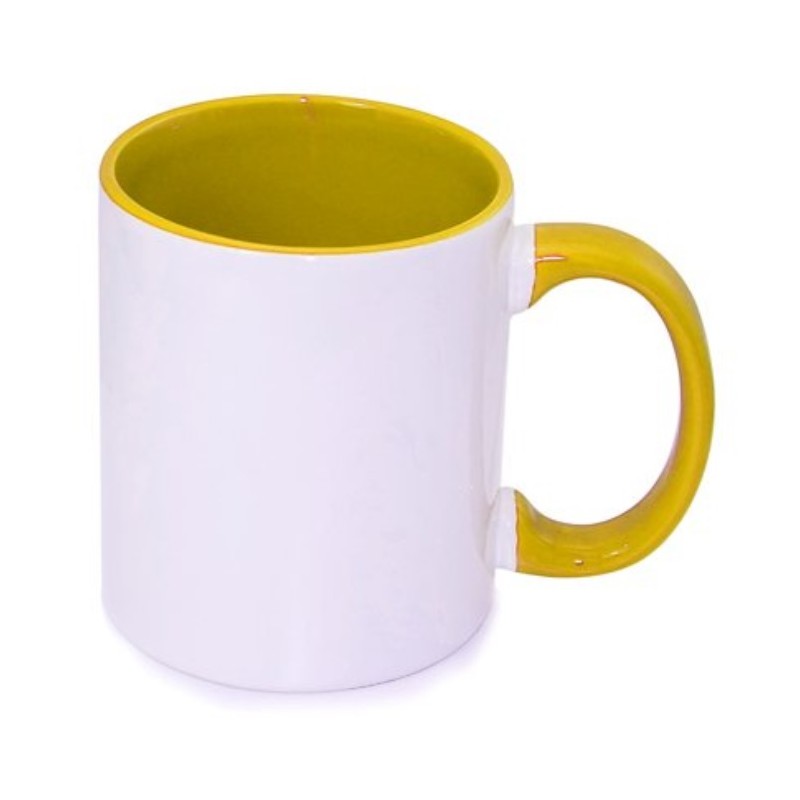 Biały kubek ceramiczny z Twoim nadrukiem Full Kolor HD+, z kolorowym wnętrzem i uchem dostępny w 12 kolorach do wyboru, klasa jakościowa A+, wysoka biel i połysk, przeznaczony do mycia w zmywarkach i kontaktu z żywnością.