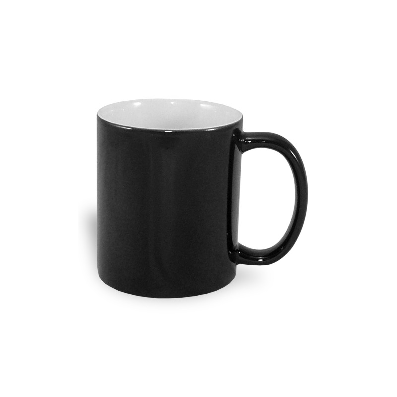 Czarny półmatowy kubek magiczny z białym wnętrzem z Twoim nadrukiem Full Kolor HD+, klasa jakościowa A+, przeznaczony do mycia w zmywarkach i kontaktu z żywnością. Nadruk ujawnia się pod wpływem wlania gorącego płynu.